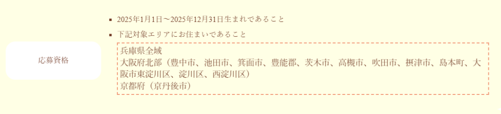 今回は兵庫県と大阪・京都の一部地域で生まれた赤ちゃんのいる家庭がもらえる